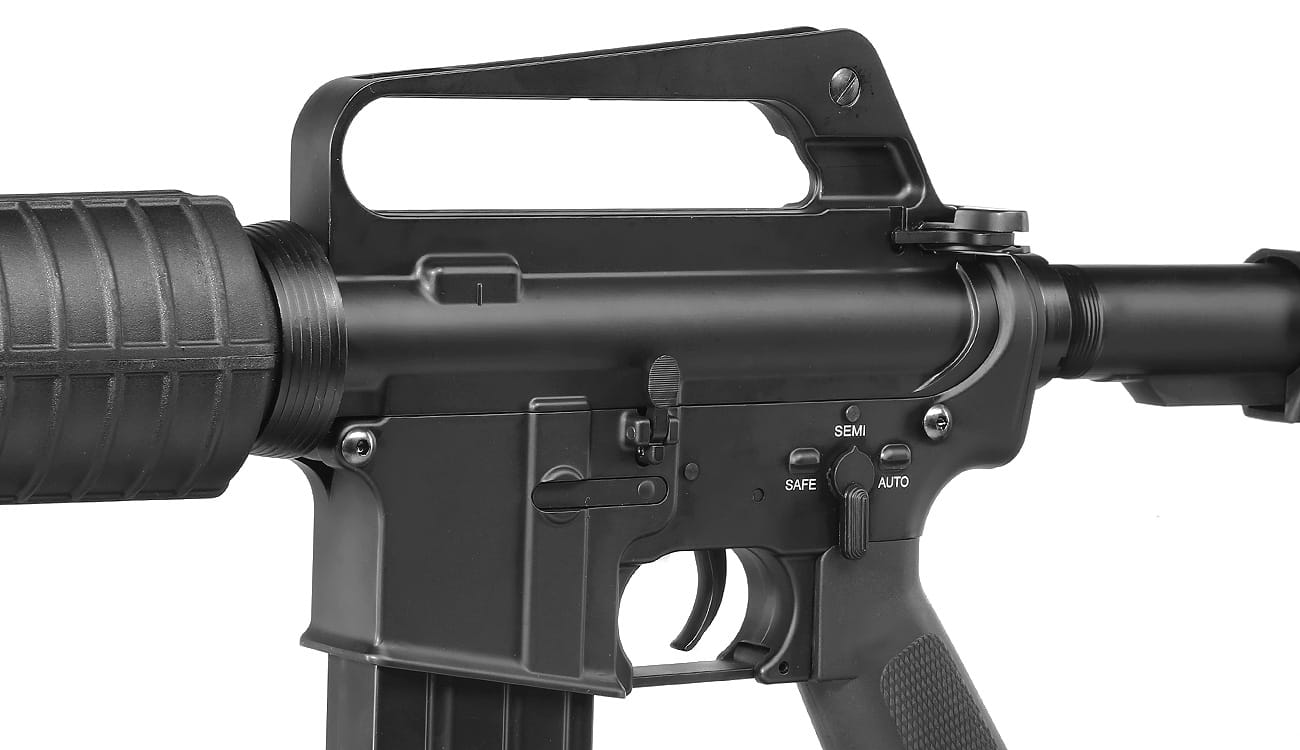 Replika AEG kultowego karabinka XM177, czyli skróconej wersji karabinu szturmowego M16, używana w trakcie konfliktu w Wietnamie. Posiada precyzyjnie wykonany, w całości metalowy korpus wraz ze zintegrowanym uchwytem transportowym. Solidne wykonanie oraz anodowane matowe, czarne wykończenie nadają karabinowi bardzo autentycznego wyglądu, Z przodu lufy znajduje się charakterystyczny dla tej wersji dlugi tłumik, posiadający lewoskrętny gwint 14mm, dzięki czemu może byc zdemontowany. Replika posiada regulowany w pionie celownik oraz metalową muszkę wraz z ozdobną imitacją mocowania bagnetu. Łoże oraz rękojeść repliki wykonane są z trwałego kompozytu polimerowego. Zastosowany w karabinku gearbox w wersji Reinforced V2, bazujący na 8mm łożyskach kulkowych wraz z solidnym stalowym zestawem zębatek zapewniają niezawodne strzelanie. Celność repliki zapewnia precyzyjna lufa wewnętrzna 6,02 mm oraz łatwy w regulacji hop-up przy wykorzystaniu pokrętła bębnowego.