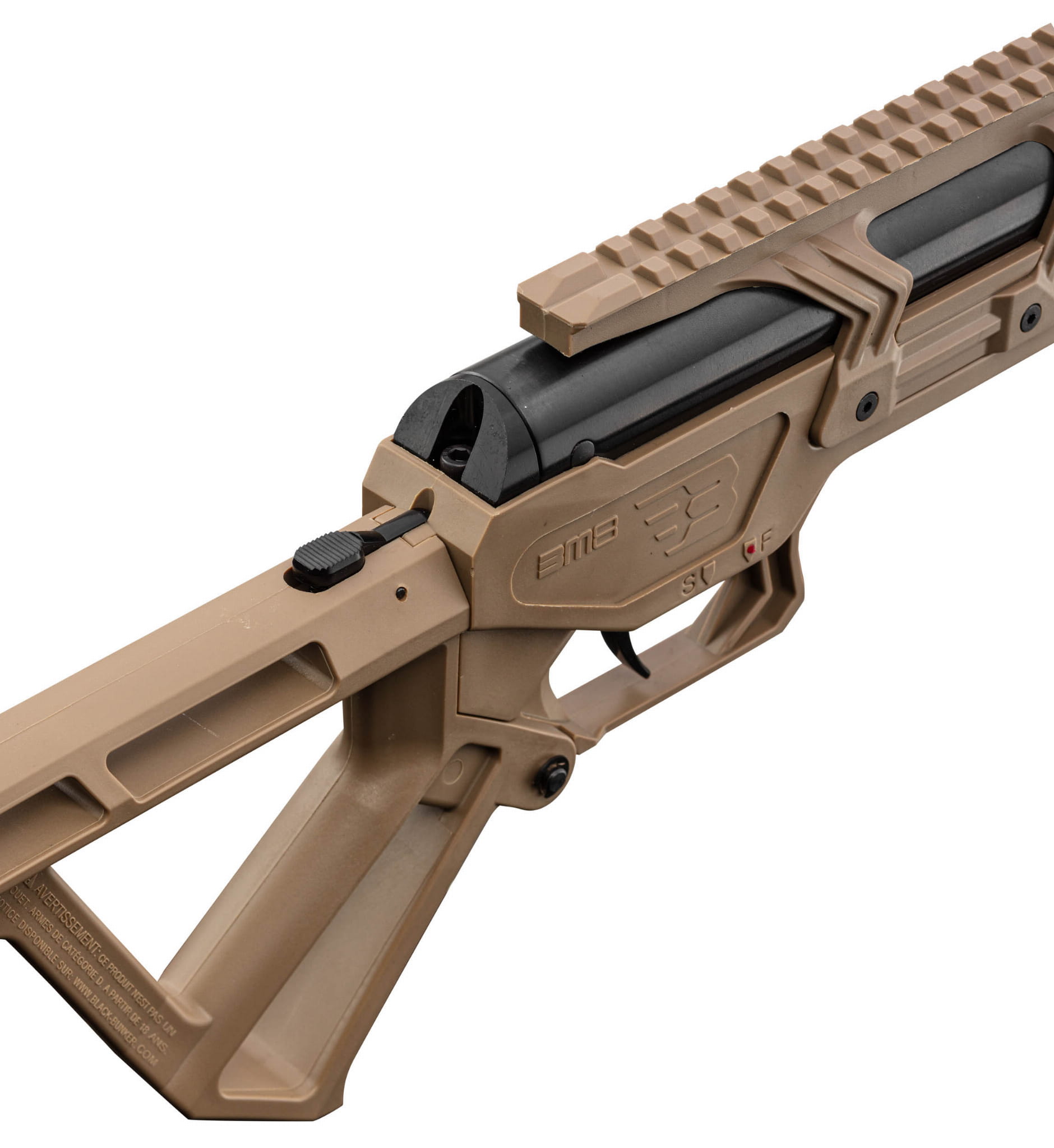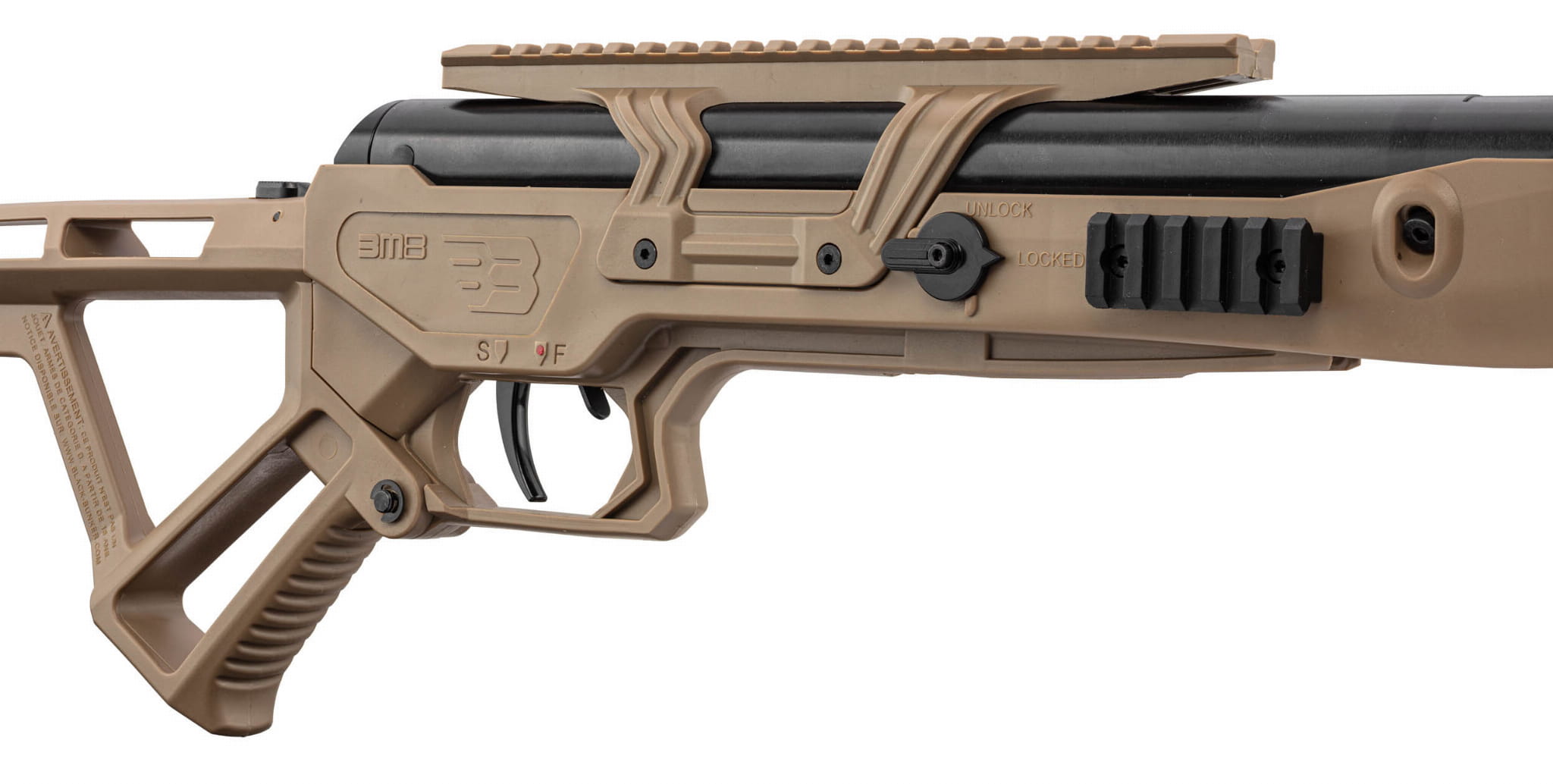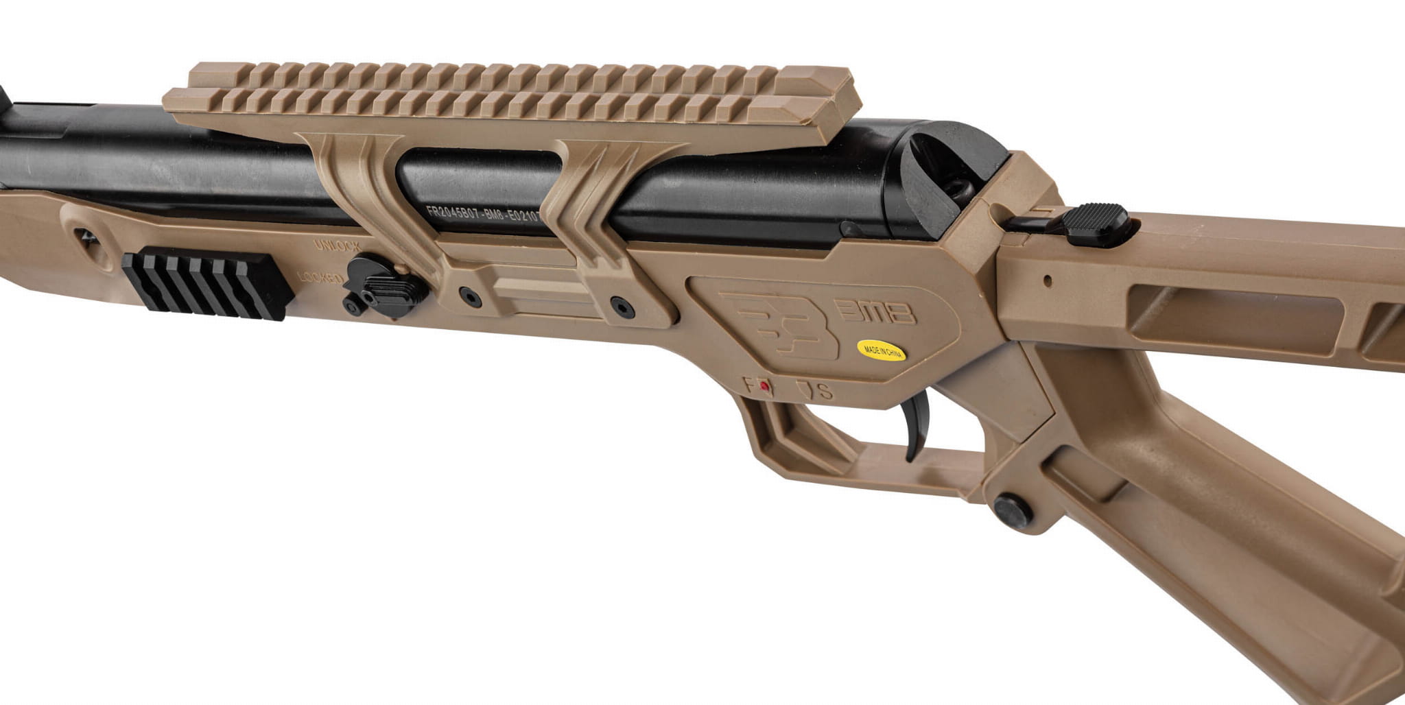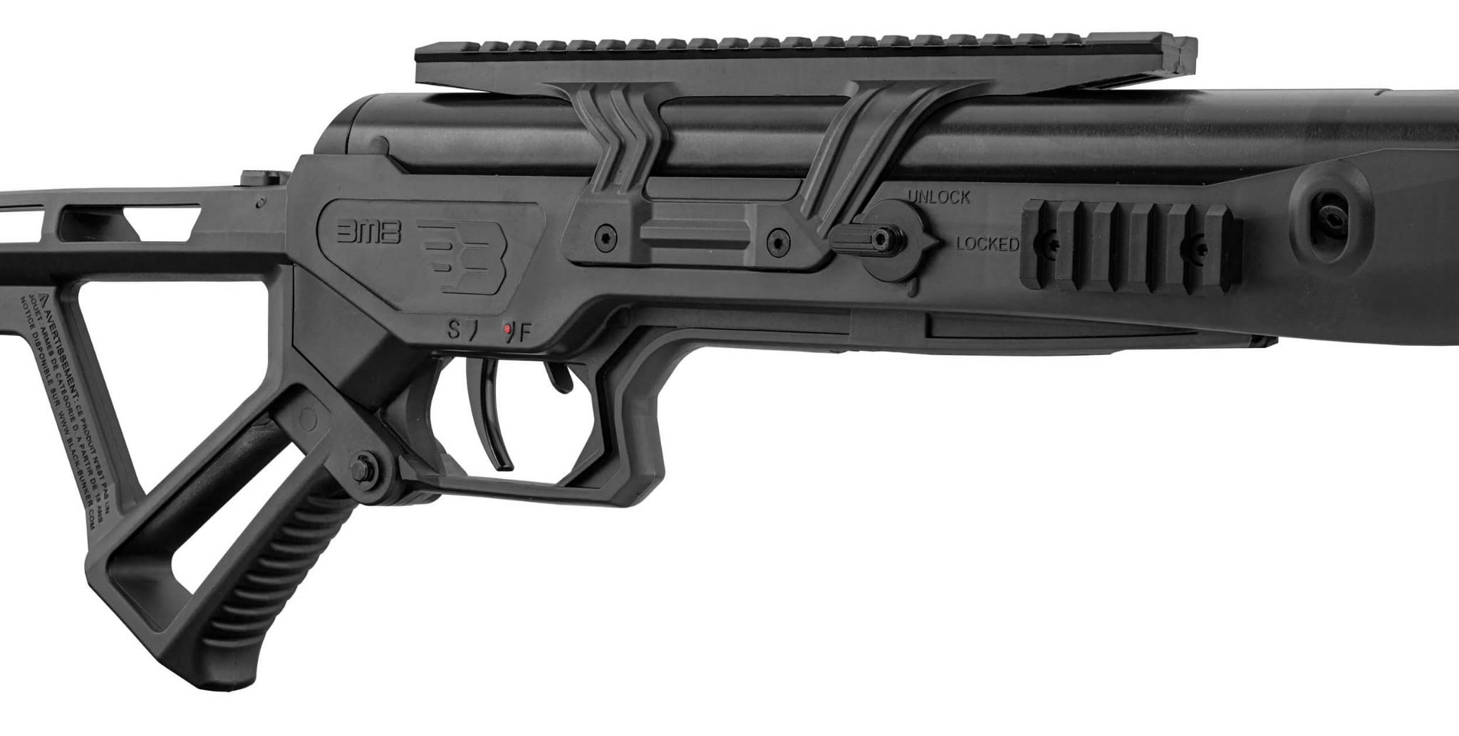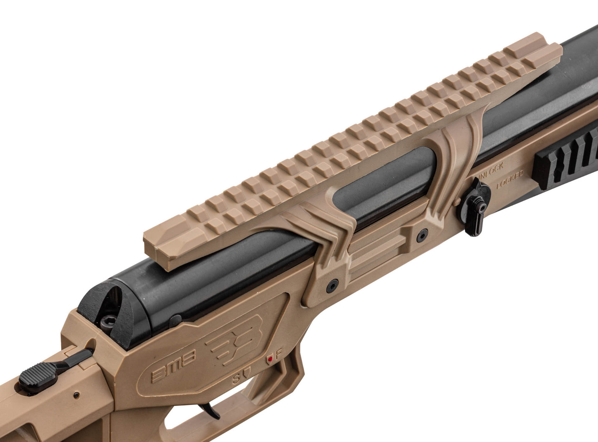 Wiatrówka BM8 jest napędzana systemem gazowym, posiada kompaktową wzmocnioną konstrukcję polimerową, z szynami montażowymi Picatinny - zarówno górną do mocowania przyrządów celowniczych jak i szyny boczne, umożliwiające montaż dodatkowych akcesoriów, np. latarki, bipoda.
